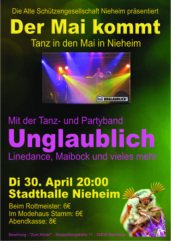 Die Alte Schützengesellschaft Nieheim präsentierte in diesem Jahr am 30. April eine besondere Veranstaltung. Seit langer Zeit fand wieder ein „Tanz in den Mai“ statt. Dieser könnte zukünftig eine Tradition in Nieheim werden und das kleine Schützenfest oder das Bürgerfest als regelmäßige Veranstaltung ablösen.